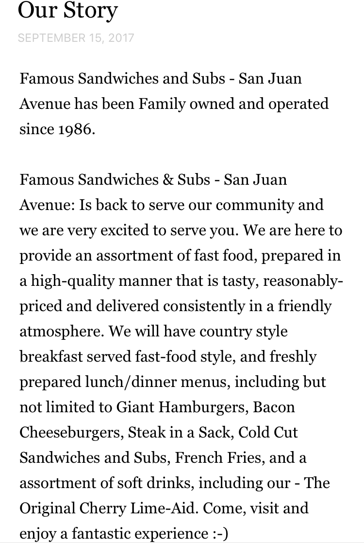 Introducing the Menu at Famous Sandwiches & Subs is a delightful experience for sandwich lovers in Jacksonville, FL. Nestled at 6404 San Juan Ave, this eatery specializes in hearty sandwiches and subs that make your taste buds dance. The menu boasts a variety of options, from classic subs to creative specialty sandwiches, each crafted with fresh ingredients and bold flavors.